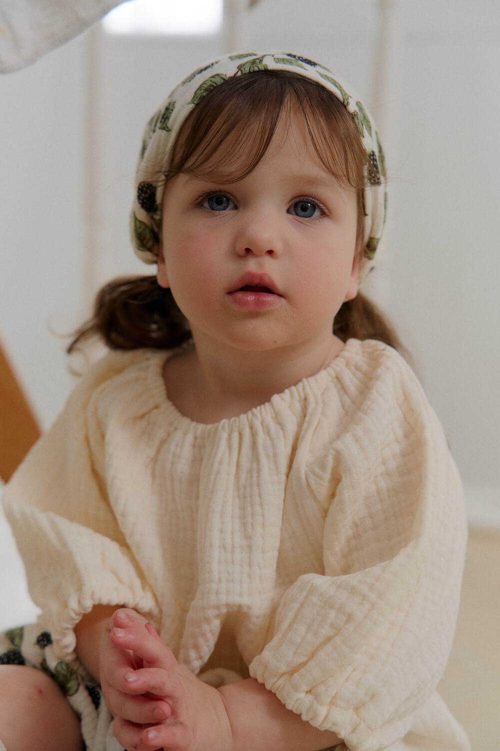 바이오 가공 워싱을 거친 3중 골지 거즈 소재로 부드럽고, 고무 밴딩의 프리 사이즈(머리둘레 47–52cm)로 편안하게 착용할 수 있습니다.