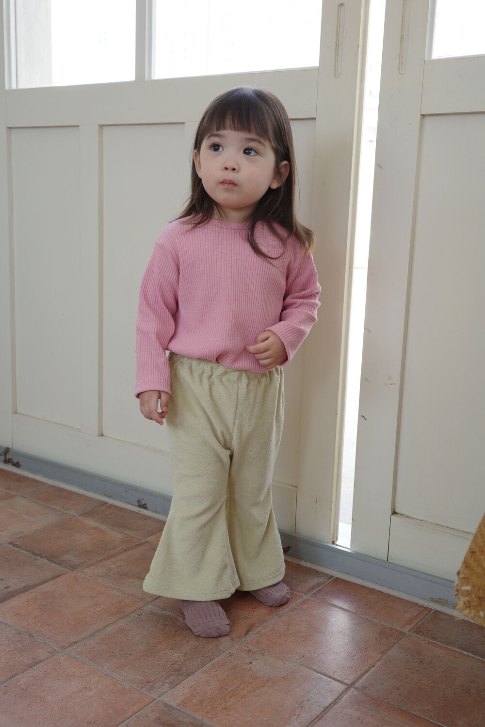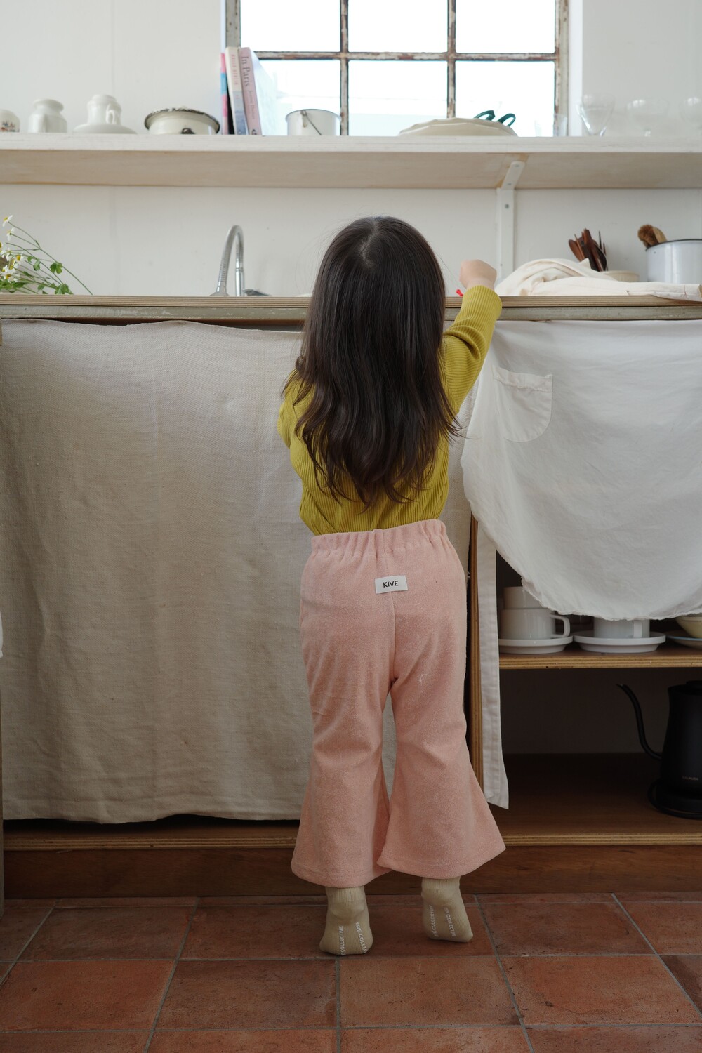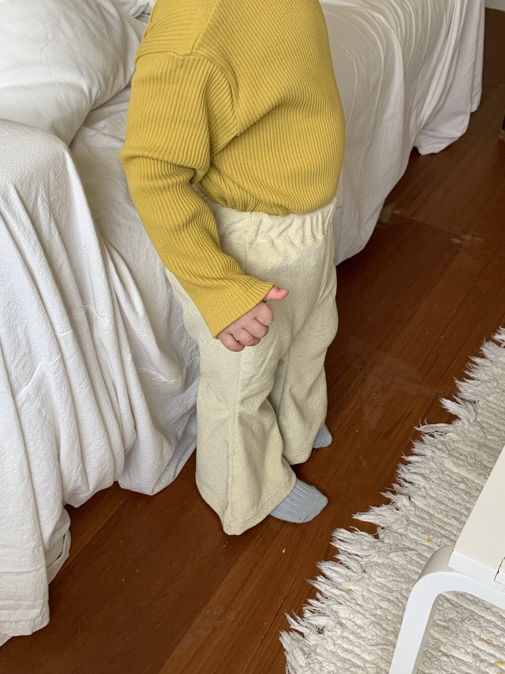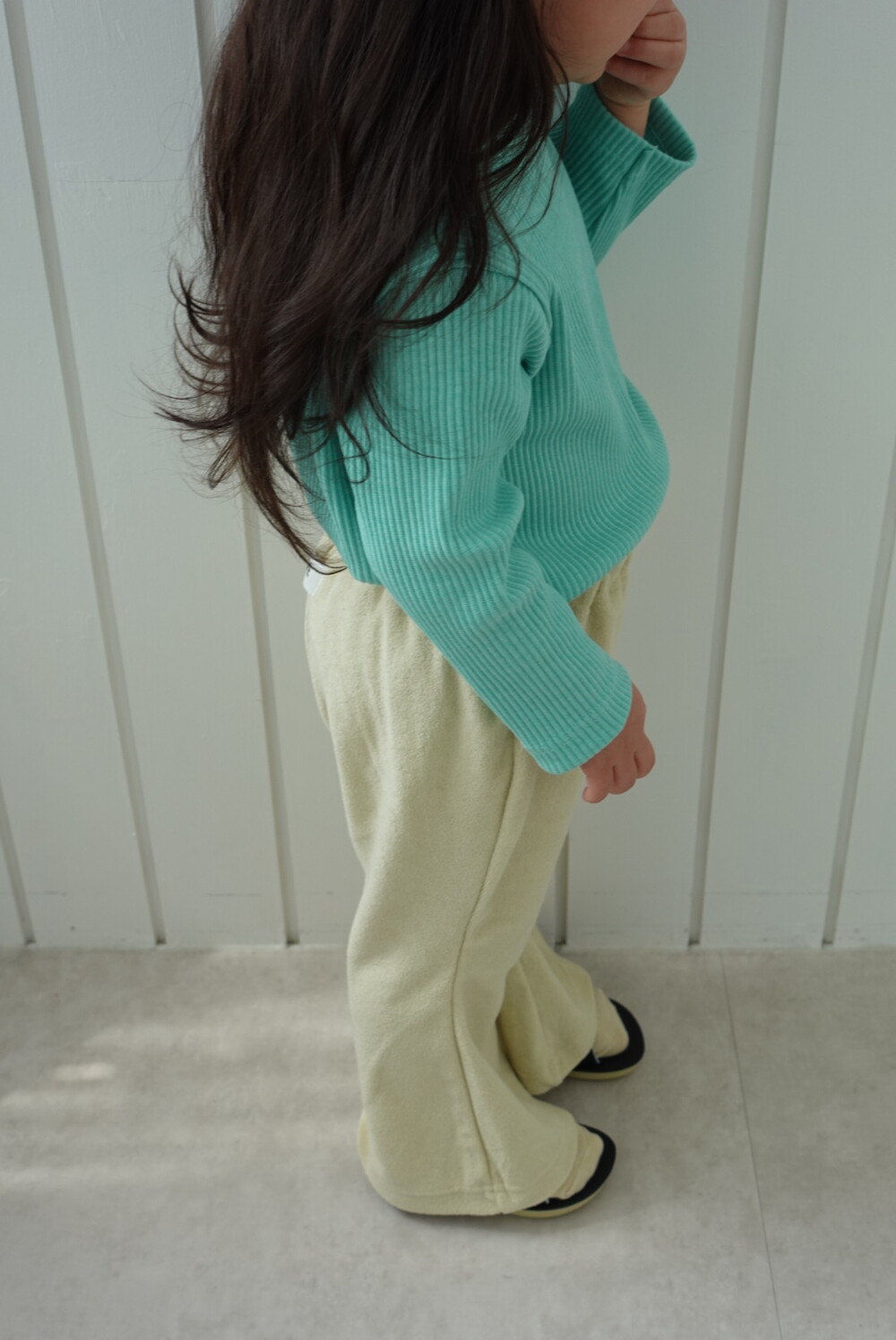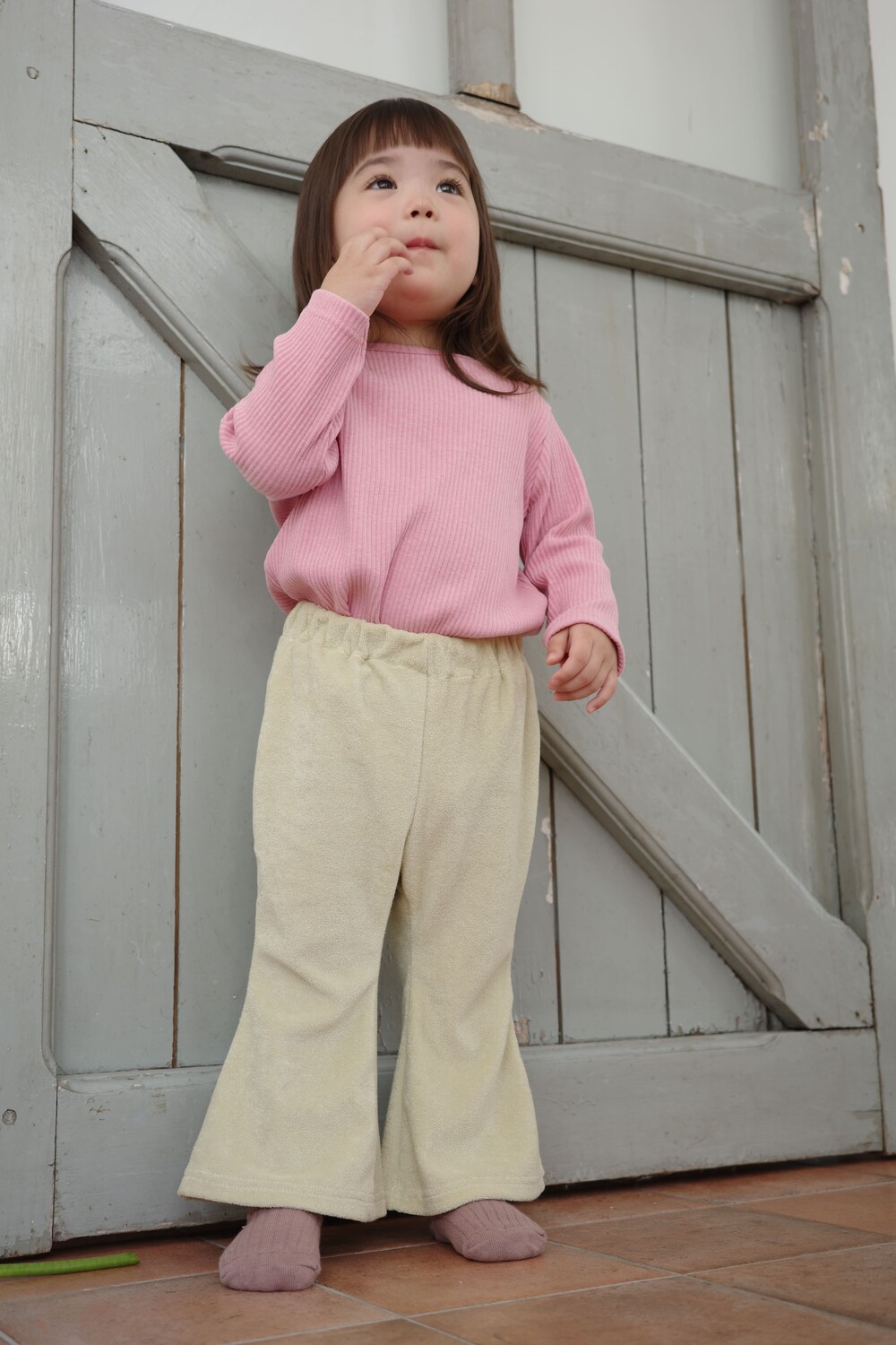 부드러운 테리 소재로 제작된 나팔 팬츠입니다.